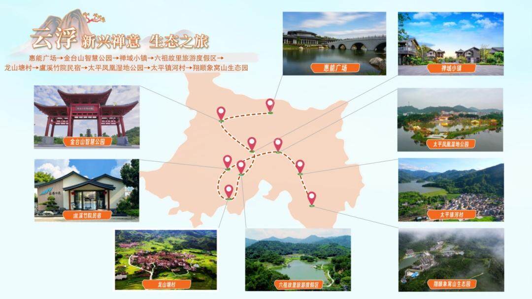 新兴县的美丽生态游览线路:惠能广场→金台山智慧公园→禅域小镇→六祖故里旅游度假区→龙山塘村→盧溪竹院民宿→太平凤凰湿地公园→太平镇河村→翔顺象窝山生态园。